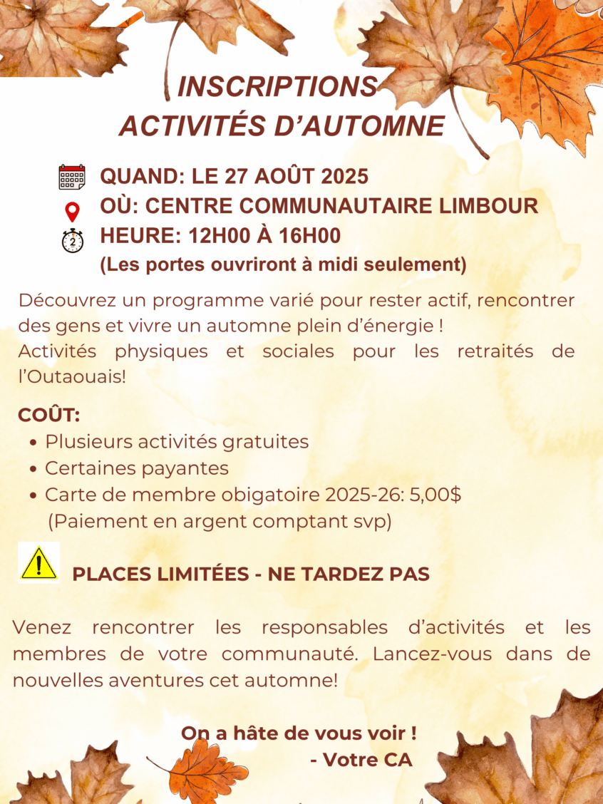 Nous sommes heureux de vous annoncer l’ouverture des inscriptions pour les activités d’automne ! Rejoignez-nous le 28 août pour découvrir notre programme varié et stimulant. Que vous soyez passionné de bien-être ou simplement curieux de vivre de nouvelles expériences, il y en a pour tous les goûts ! Le Centre propose une multitude d’activités sociales et physiques pour les retraités … En savoir plus