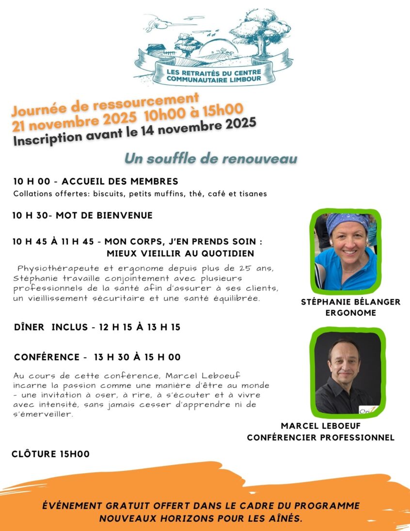 Vous êtes conviés à notre journée de ressourcement le 21 novembre 2025 de 10h à 15h. Nous vous invitons à vous inscrire au lien ci-bas et à consulter le PDF d’information ci-joint au bas de la page.